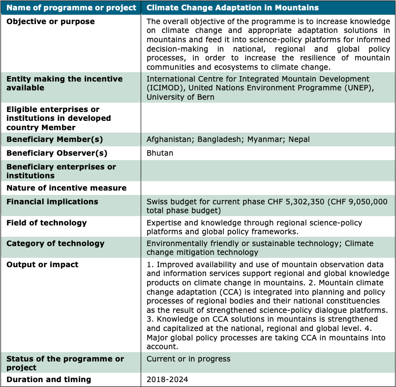 Under TRIPS Article 66.2, developed country members are committed to incentivizing technology transfer to LDCs, enabling them to create a sound and viable technological base. Although Article 66.2 does not explicitly impose notification obligations, a 2003 Decision by the Council for TRIPS requires developed country members to submit annual reports on actions taken or planned to fulfill their commitments under Article 66.2. Since 2020, over 200 reported programs or projects have been climate-related. Below is an example from Switzerland that supports climate adaptation in mountain areas within LDCs.